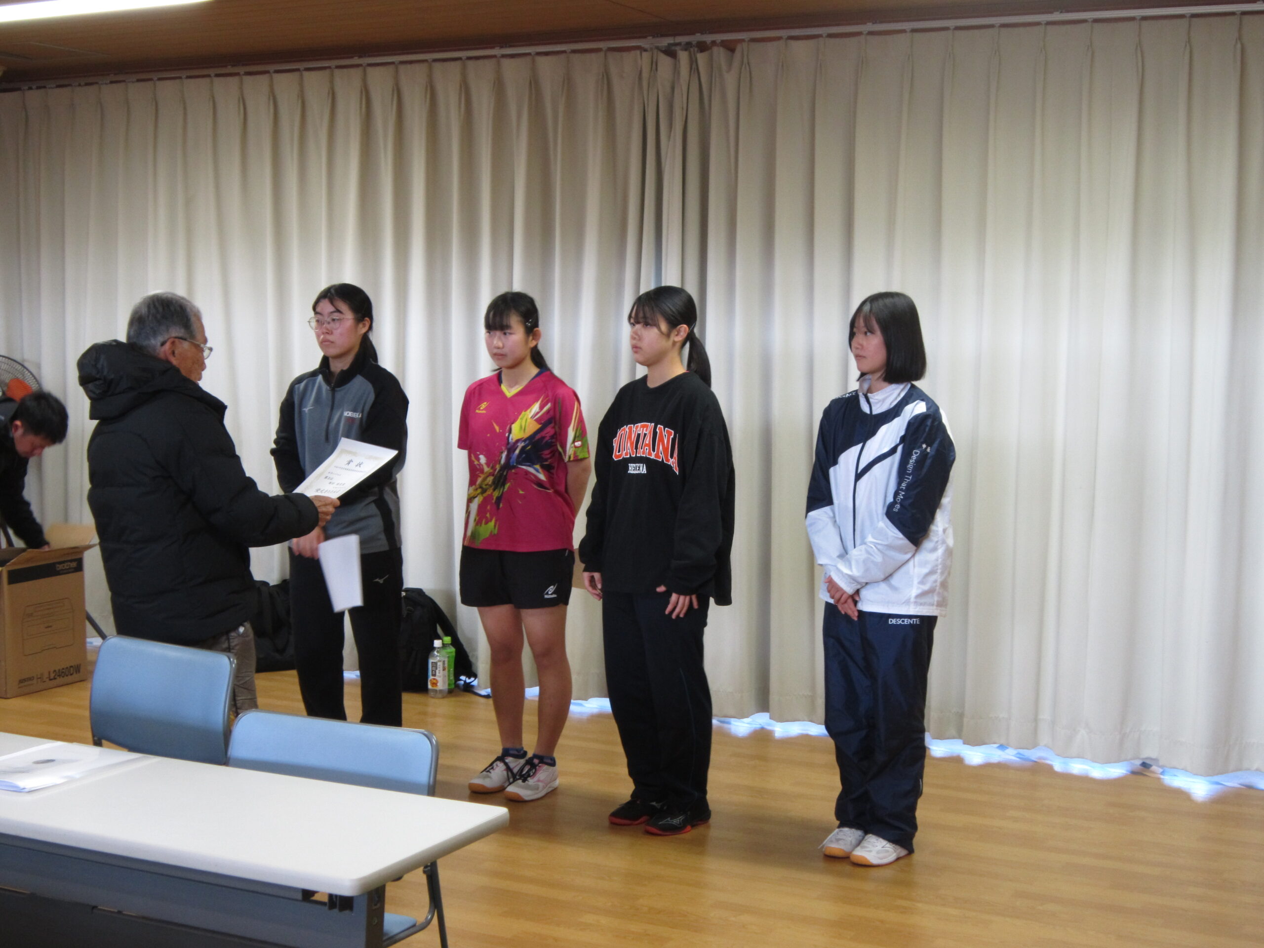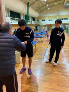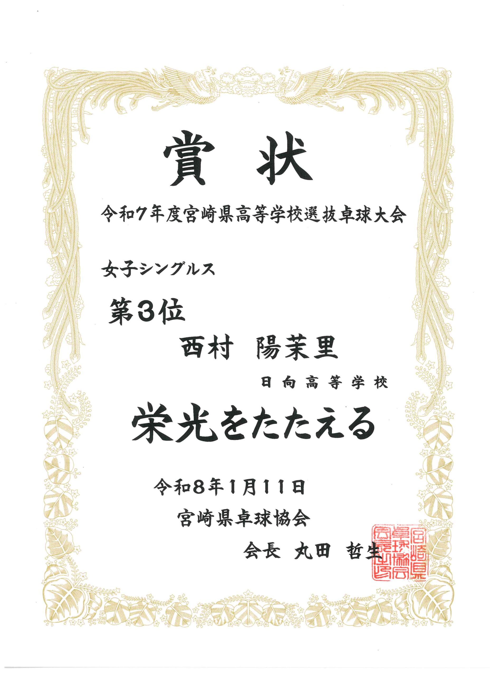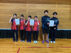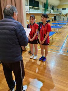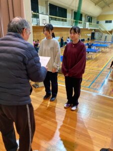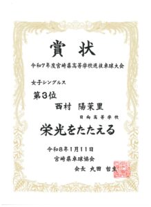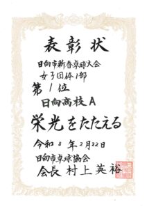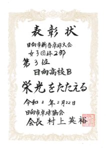 シングルスにおいては、男子卓球部では昨年11月に開催された日向市総合文化祭卓球大会において米良海晴選手が第3位入賞、女子卓球部では昨年12月に開催された延岡市卓球協会長杯卓球大会において中嶽かんな選手が第3位入賞、選抜大会において西村陽茉里選手が第3位に入賞しています。