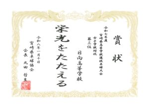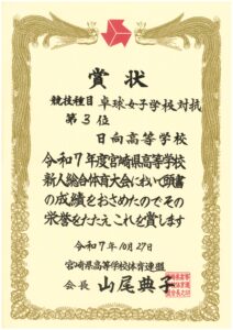今年1月に開催された「令和7年度宮崎県高等学校選抜卓球大会(選抜大会) 兼令和7年度年度全国高等学校選抜卓球大会(シングルスの部)宮崎県予選会」では、女子卓球部が女子学校対抗で第3位となり、令和8年度に開催予定の「宮崎県高等学校総合体育大会(高校総体) 第79回卓球競技大会」の女子学校対抗において、第3シードを獲得しました。次回の高校総体での上位入賞を目指して練習を続けています。