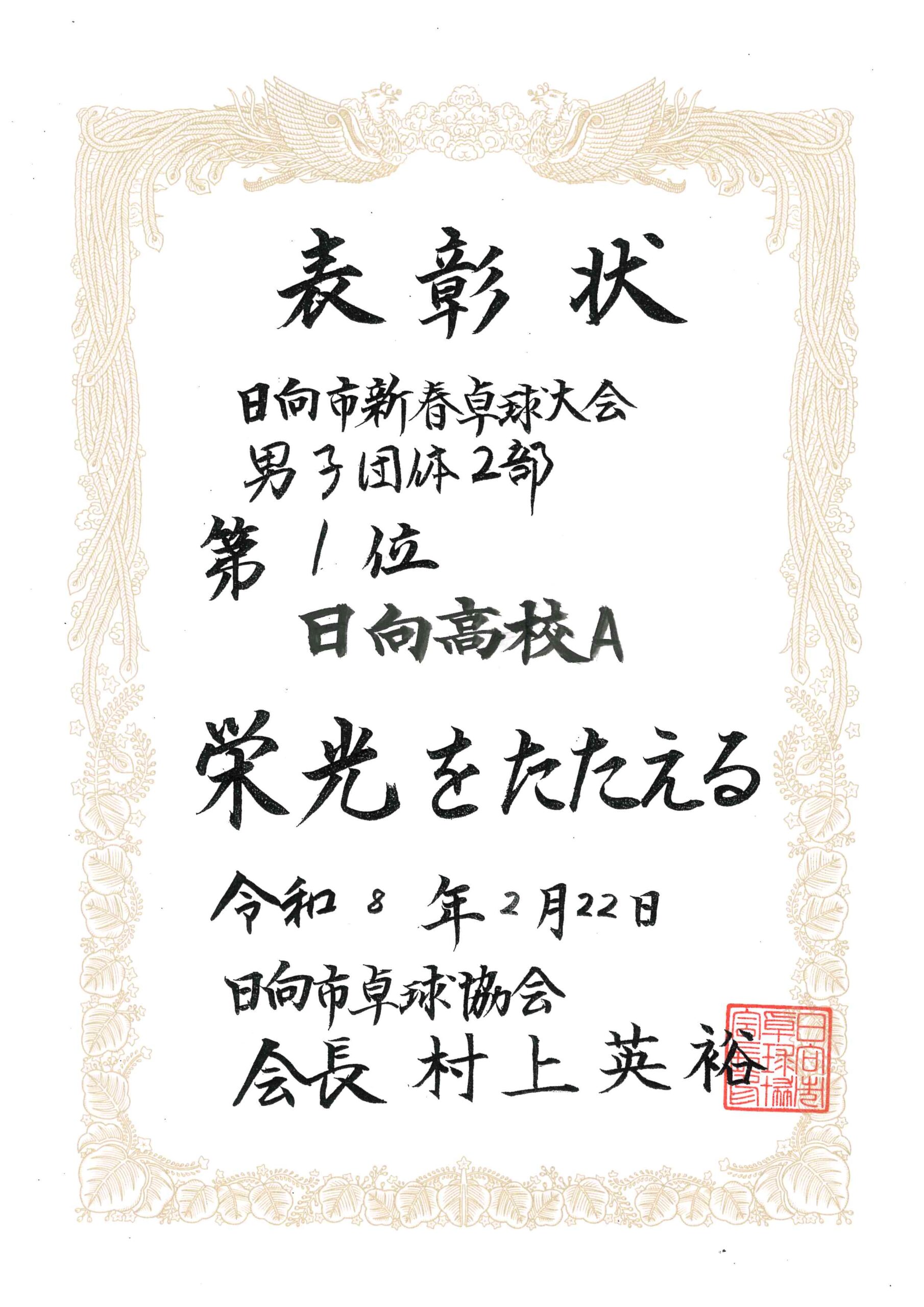 先日2月22日に開催された「日向市新春卓球大会」では、保護者も参加された男子卓球部Aチームが男子団体2部で第1位、女子卓球部Aチームが女子団体1部で第1位、同Bチームが女子団体2部で第3位でした。その他、クラブチームや他校との合同チームで参加した生徒たちも躍動していました。