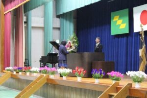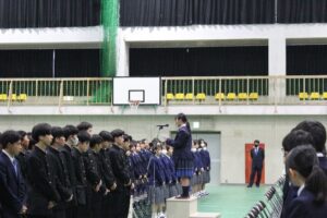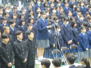 続いて行われた対面式では、生徒会長の中嶋和奏さんが「共に切磋琢磨することを楽しみにしてます」と歓迎の言葉を述べ、新入生を代表して楠真綺さんが「まずは紺青ウォークで先輩たちと親睦を深めたい。」と挨拶しました。